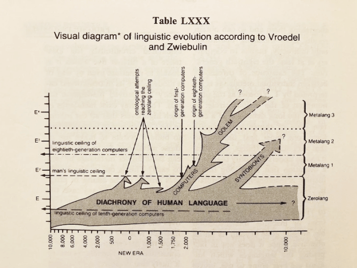 One of my favorite of Lem’s quasi-scientific graphs is the one below, on language development from his collection Imaginary Magnitude. I discussed it in the book, and we republished it in the project Latent Spacecraft. The graph shows computers taking use of human languages and inventing their own, which we cannot access. This is already happening in generative adversarial networks (GANs) that are encoding new information, unknown to us, into silences.
