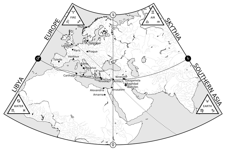 Within the Tetrabiblos, Ptolemy’s astronomy, astrology, and geography come together in a remarkable discussion of “astral geography.” Ptolemy’s system for linking terrestrial and celestial real estate endowed his astrology with a sense of space as well as time. It also greatly multiplied the number of correspondences to consider. Ptolemy’s resulting astrological world map is a fascinating document of attitudes toward race and ethnicity in the ancient world. For our modern world, it provides a fun illustration that even our modern methods of analysis are hardly immune from the timeless pitfalls of pattern-matching.