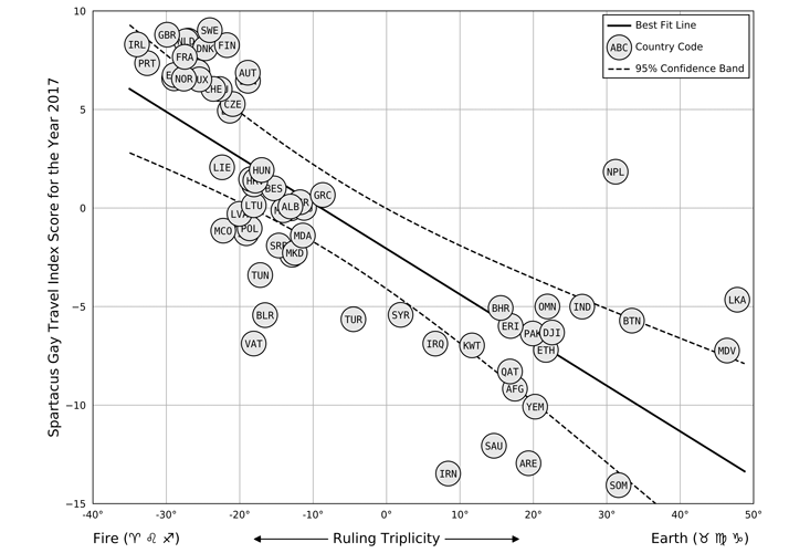 A linear regression (Figure 2, above) suggests that they are. Specifically, the regression’s best-fit line tells us that for every 10 degrees of “fire–earth longitude” we travel, we can expect the Spartacus Gay Travel Index score to drop by about two and a half points. Regressions like this are a fixture of technical and scientific reports, but what do they really mean? If we’re being fair, shouldn’t this analysis, which indicates that a correlation does exist, compel us to accept Ptolemy’s astrosexual theory? Not so fast. As the saying goes, correlation does not equal causation. With enough data sets to choose from, it’s not difficult to find two that are correlated, and it can become a bit of a sport to pick out the most absurd or humorous cases. (For example, the correlation between the number of civil engineering doctorates awarded per year and mozzarella cheese consumption in the United States.)