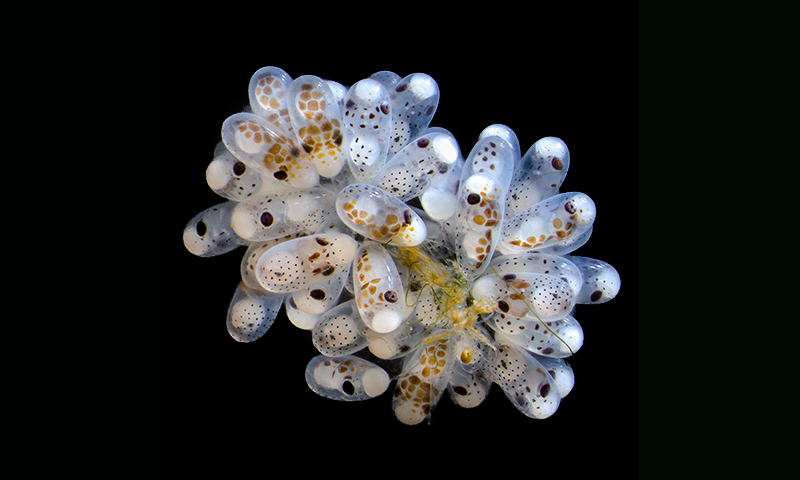 Like tiny grapes tethered together by a vine, a clump of Caribbean two-spot octopus eggs (Octopus hummelincki) huddles under the watchful gaze of a magnified camera lens. The cluster, which measures just under 1 centimeter in diameter, holds the lives of dozens of fragile, weeks-old embryos.