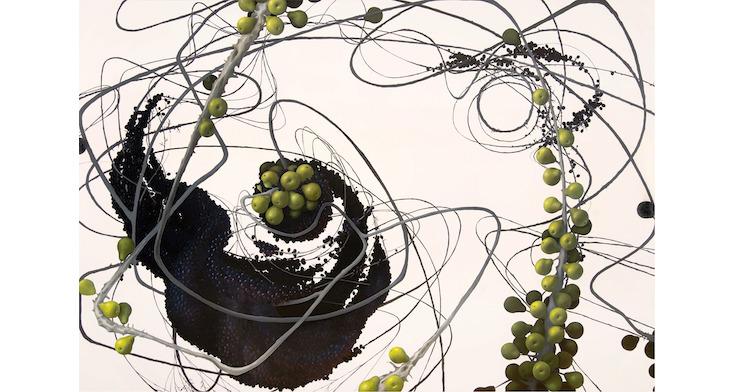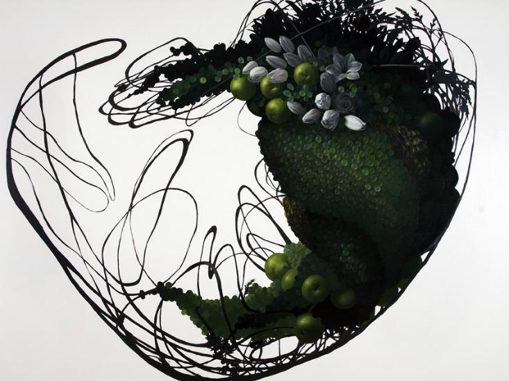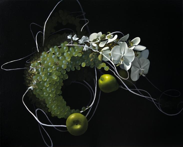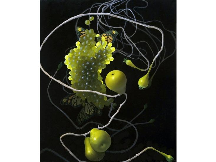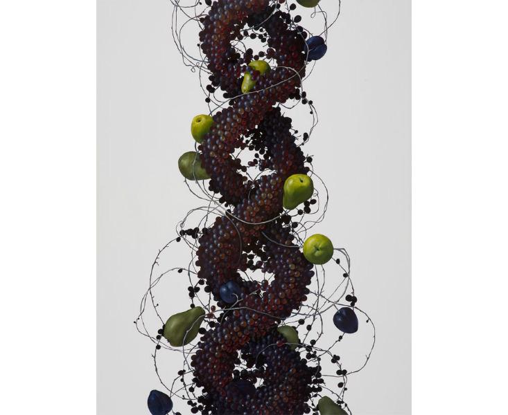 Brownell has been painting what she calls “molecular still lives” for over a decade. She begins most works with a base of abstract, swirling forms inspired by the structures of proteins, and then adds foods typically seen in traditional still lives. Grapes are a favorite of hers, as their orb-like shape lends a cellular look. Brownell strives to raise awareness and evoke primal questions about our food supply, from how it is grown and how it functions in our bodies, to how it impacts society.