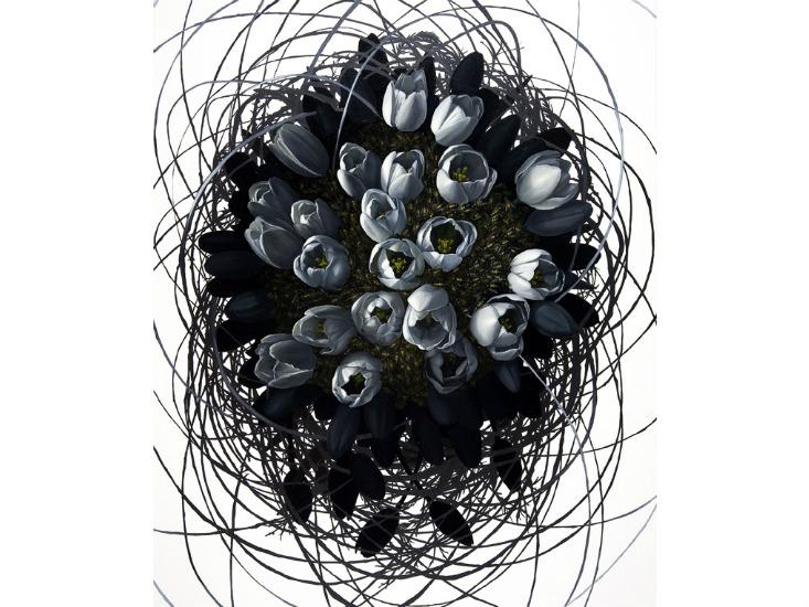 Other works examine the worrying disappearance of insect species. For instance Still Life with Lost Pollinators and Still Life with Lost Pollinators II show honey bees huddling together, no longer seeking pollen from nearby blooms. Both paintings directly address colony collapse disorder.