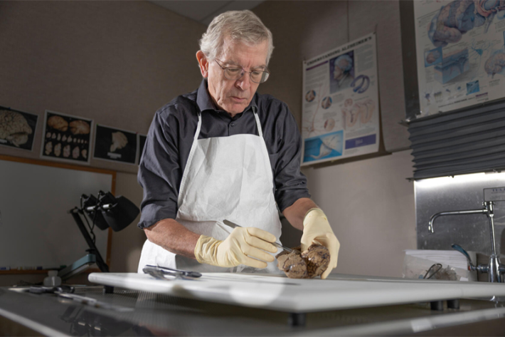 The formalin-fixed half of his brain was set in a refrigerator to be dissected and sampled in the “brain-cutting conference.” Dickson cut standardized sections from the major brain areas while Ph.D. students read out the donors’ cause of death. A neurohistologist—a specialist who studies the microscopic anatomy and connections of the brain—embedded the tissue sample into paraffin wax and applied pink and purple dyes to make slides resembling fibrous stained-glass windows. These slides are used to look for specific pathologies under a microscope and digitized in a scanner so researchers can view the tissue on a large scale on a computer screen to analyze the cells. Brains are de-identified so scientists don’t know who the donor was.