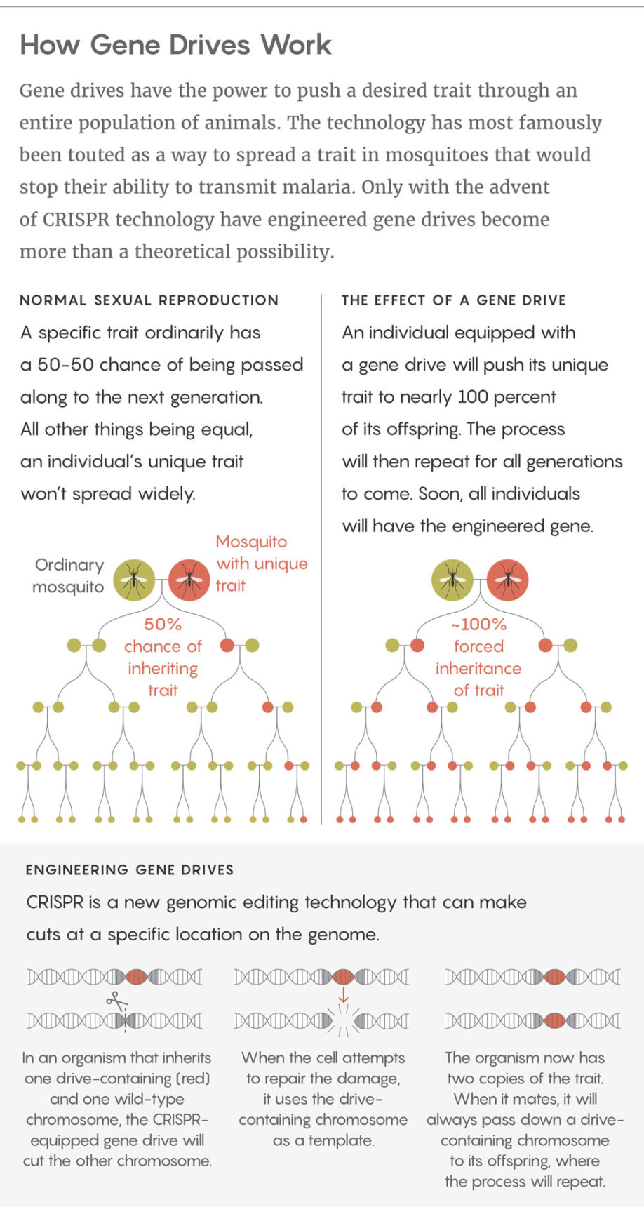 Gene drives are genetic constructions that can be inserted into DNA to change the rules of inheritance in sexual reproduction. They can boost the chances that a particular trait will pass from a parent to its offspring from 50-50 to nearly 100 percent. The technology is so far limited to the lab, but many scientists hope to eventually use it to control disease-carrying insects, invasive species, and other problematic organisms.