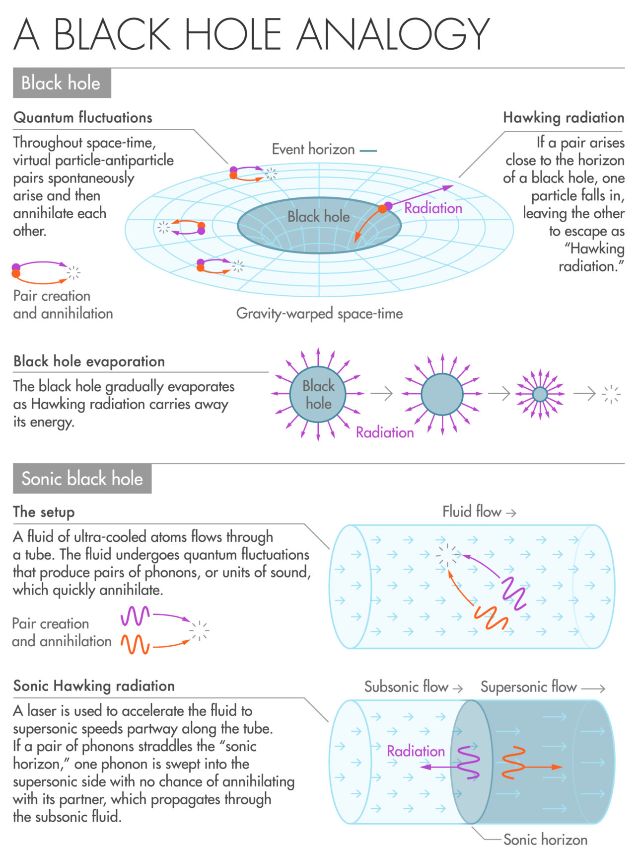 Last month, a team of physicists reported in Nature that a sound-trapping fluid, analogous to a black hole that traps light, radiates a featureless spectrum of energies, just as Stephen Hawking predicted for the invisible spheres he was famous for studying. But opinions differ about what this sonic analogue of a black hole reveals about the real kind—such as the one recently seen in silhouette in a first-ever photograph.