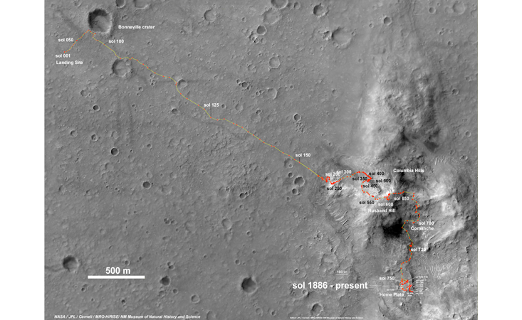 Spirit’s outing began with a landing in a crater called Gusev, which might have produced local flooding when the heat of an asteroid impact melted buried ice. It covered so much territory that team scientists had to keep coming up with names for local features so they could stay oriented. Many of those names, including Columbia Hills, were selected in memory of the Challenger space shuttle mission, which ended in disaster in 2003; some remain more informal. An outcropping called Home Plate got its name for the crashingly simple reason that it resembles a baseball home plate.