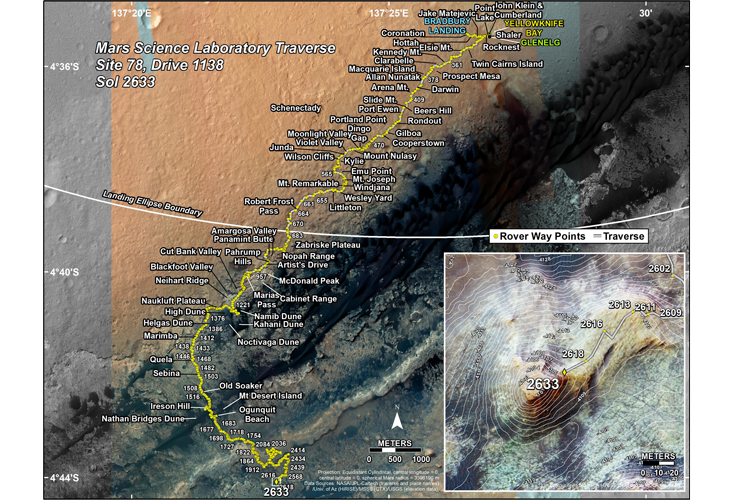 With all that imagery flowing in, mission scientists have gone a little crazy giving names to every rock and feature that Curiosity has passed in the 13.4 miles it has traveled so far, as you can see from the map. Data gathered by the earlier missions also guided Curiosity’s landing site in Gale Crater, a 3.5-billion-year-old, 96-mile-wide impact site that was subsequently filled with wet sediment and dust, then eroded away. That unusual geological setting has allowed Curiosity to examine different eras of Martian history as it drives around the crater.