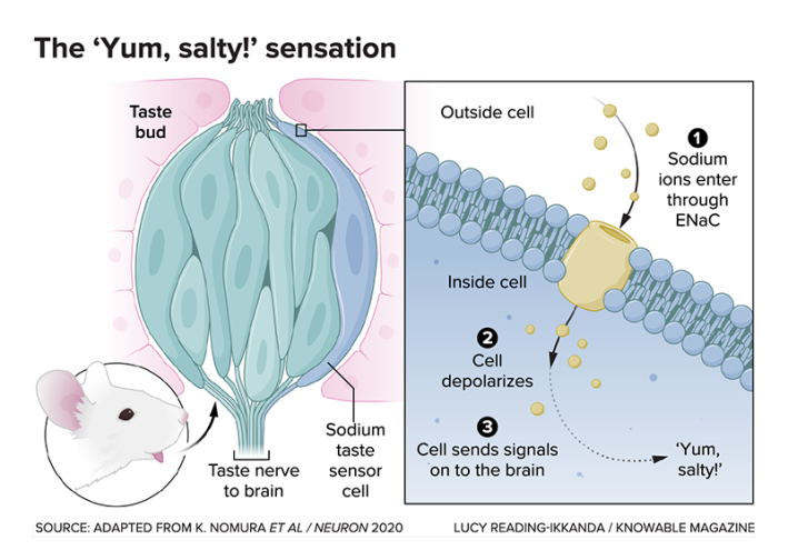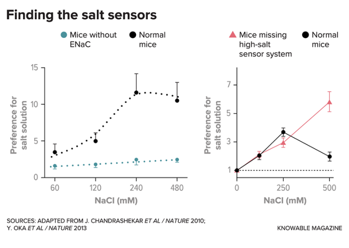 To prove it, scientists engineered mice to lack the ENaC channel in their taste buds. These mice lost their normal preference for mildly salty solutions, the scientists reported in 2010—confirming that ENaC was, indeed, the good-salt receptor.