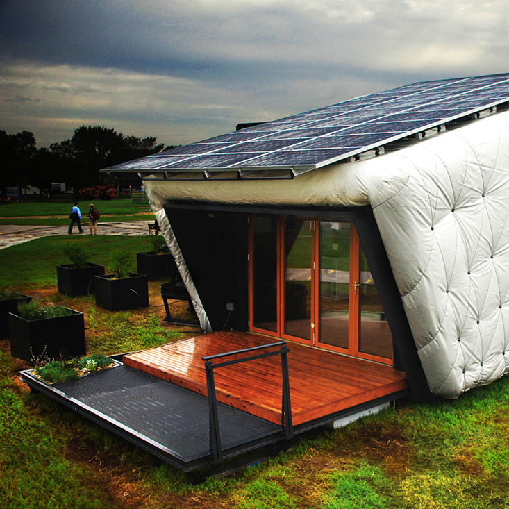 Nearly all of the houses in the Challenge feature solar panel roofs. But a dwelling from frosty Canada takes maximum advantage of Alberta’s sunny skies by also harnessing sunshine with a board comprised of forty glass tubes beside the house. Within each glass tube is a copper pipe filled with liquid heated from the sun. Water stored in a tank within the house circulates though the glass tubes, picking up heat from the pipes and returning to the tank where people can use it to shower—no furnace required.
