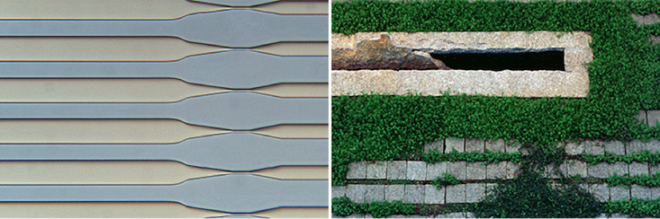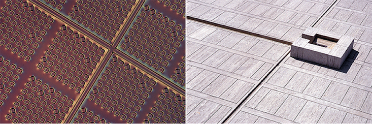 Take the photographs above. If you zoom out from the defined grey channels, Frankel says, you’d see a microfluidic device, a tool that exploits the small-scale properties of fluids, like surface tension; and if you zoom into the hedged image of the atrium, she says, “We’d start seeing the roots of the plants, and the rough edges of the stone. The more detail we have, the more we question, ‘Are there real demarcations between one [thing] and another?”