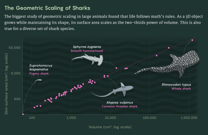Recently, researchers used CT scans and digital tools to calculate the surface areas and volumes of an ancient and diverse animal lineage: sharks. The team’s analysis, published in Royal Society Open Science, included more than 50 shark species and provides some of the best empirical evidence to date for some kind of firm scaling rule in zoology. As with a sphere, the surface area and body mass of sharks do indeed follow a two-thirds scaling law, the team found. If this holds true in other animal groups, it probably reflects underlying rules of heat exchange, metabolism or development that constrain evolution.