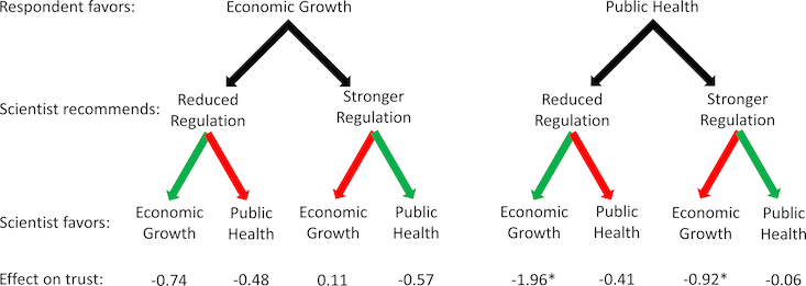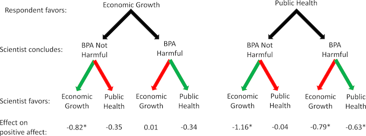 In the first one, subjects read a vignette of a scientist giving a public talk in Washington, D.C. on the health risks of Bisphenol A (BPA), an endocrine-disrupting compound used in plastic consumer products. There’s an ongoing controversy about its effects. The researchers manipulated the vignette to have the scientist’s conclusion (BPA harmful or not harmful) comport with her explicitly stated values (a policy preference for either “protecting public health” or “promoting economic growth”) on the one hand, and diverge on the other; they also accounted for whether the subjects’ values aligned with the scientist’s in each case. In the second experiment, the vignette is manipulated in the same way but features a policy recommendation from the scientist rather than a statement summarizing the weight of the scientific evidence.