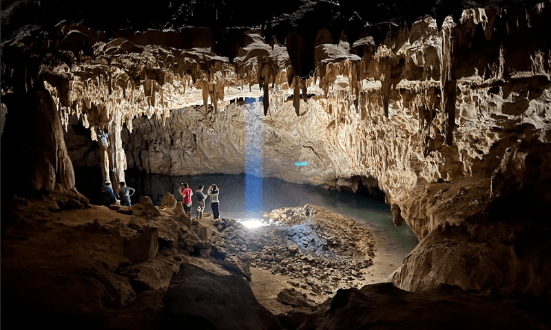 Lead photo: Tourists explore the "Dome of the Cathedral," the largest chamber in Grutas Tzabnah, the cave in Yucatán, Mexico, where the researchers found the stalagmites they studied. A human-made well ‘La Noria’ now illuminates the cave. Credit: Mark Brenner, 2023.