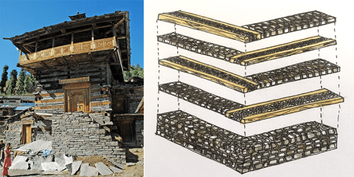 In the mountainous region of Himachal Pradesh in India, near where the Indian Plate is colliding with the Eurasian Plate, many structures built in the kath kuni style have survived at least a century of earthquakes. In this traditional building method, the name, which translates to "wood corner," in part explains the method: Wood is laced with layers of stone, resulting in improbably sturdy multi-story buildings.