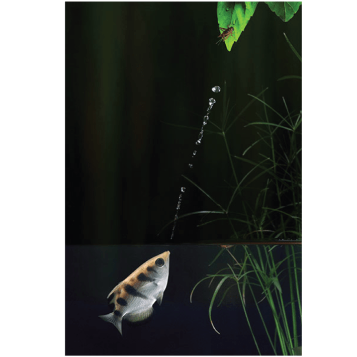 Dwelling in mangrove-filled estuaries and freshwater streams, archerfish actively hunt down land-based insects such as flies and spiders, as well as small lizards, by shooting water jets out of their specialized mouths. The fish create these jets by raising a bony tongue to the roof of the mouth, which forms a tube from which they can expel the liquid jet. The fish can spit these jets of water at speeds of 6 feet per second and accelerations of up to 400 meters per second squared—by comparison, a cheetah can accelerate at a rate of 10 meters per second squared. The jets have an impact force that is far more powerful than the anchoring force of small insects and bugs. The archerfish hone their jet-shooting skills for hunting as they grow and mature, improving both speed and precision. They can also estimate the trajectory of prey who have been struck by a jet and capture it before other predators get there first.