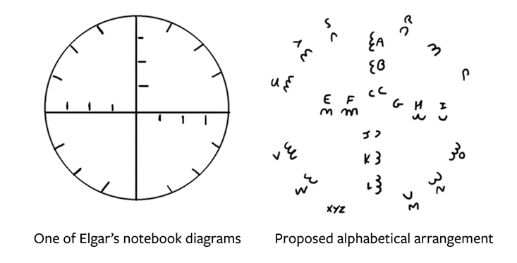 Another notable contestant was Tony Gaffney, an amateur cryptographer, who has solved several challenging ciphers. He asserted Elgar fashioned an alphabetic key for his symbols based on a clock-like diagram in one of his notebooks.2 With that key, Gaffney maintained, the symbols spelled: