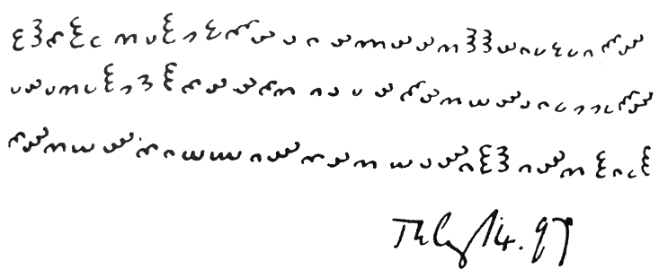 Elgar’s scribble was actually a cipher. It consisted of 87 glyphs unevenly spread over three lines. It contained 24 different symbols that featured one, two, or three cusps or curves. The glyphs were tilted in what appeared to be eight various angles. In a glance it gave the sense of seagulls, or sheep, or bits of stubble. Dora looked at it, couldn’t figure it out, put it in a drawer, and didn’t draw it out again for 40 years.