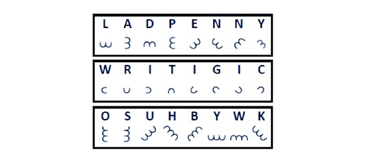 In fact, it is a classic, coded message. It is—or appears to be—based on a substitution system, in which each glyph represents one or more letters, using a known, if obscure alphabet. From the start, cryptographers faced two fundamental obstacles to breaking it. One is that the cypher defies frequency analysis. In any language, certain letters are used more often than others, and that particular distribution enables cipher analysis. But with Dorabella there aren’t enough characters to analyze.