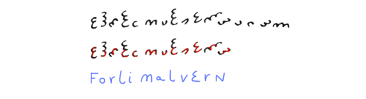 Pelling has come to believe the Dorabella cipher is actually a “non-mathematical stegotext”—in effect, a graphic cipher, a picture. He took Elgar’s habit of starting correspondences with his address, which that summer of 1897 was his house in Malvern, which the Elgars named “Forli” after an early Renaissance Italian artist who painted angels. Using those words as a crib, Pelling came up with a beginning of plaintext: