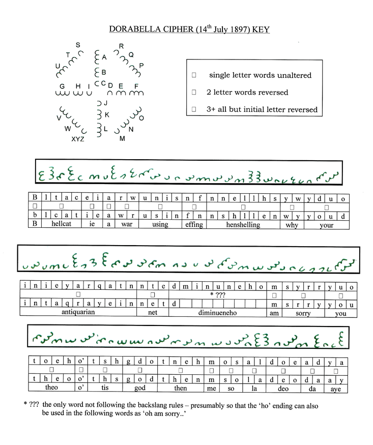 Gaffney noted that Elgar loved and often used phonetic spellings (“My Dear Dorabellllla—How many ells long is that”) and “backslang,” where, for instance, the word “cipher” becomes “crehpi.” Applying backslang to his alphabetic rendering of the note, inserting word divisions, and taking into account phonetic spellings, Gaffney determined the note read:
