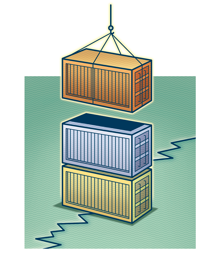 Once they enter the stream of global shipping, the boxes are shifted and routed by sophisticated computer systems that determine their arrangement on board and plot the most efficient route to get them from point to point. The exact placement of each box is a critical part of the equation: Ships make many stops, and a box scheduled to be unloaded late in the journey can’t be placed above one slated for offloading early. Imagine a block of 14,000 interlocked Lego bricks—now imagine trying to pull one out from the middle.