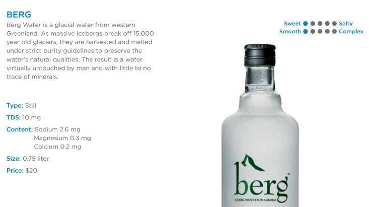 Alas, we didn’t get to taste the priciest item on the menu, a $20 Berg that was temporarily out of stock. It boasts the lowest TDS rating of all (10 milligrams), although its high value stems more from the fact that is harvested from remote icebergs in Greenland than its flavor. With almost no trace of minerals, it should be as flavorless as water is usually presumed to be. Nor did we sample the brand Riese designed, Beverly Hills 90H20 ($13). It has a similar TDS rating to the Iskilde (410 milligrams), with less sodium and calcium and more magnesium in the mix to make it ideal for pairing with food and wine.