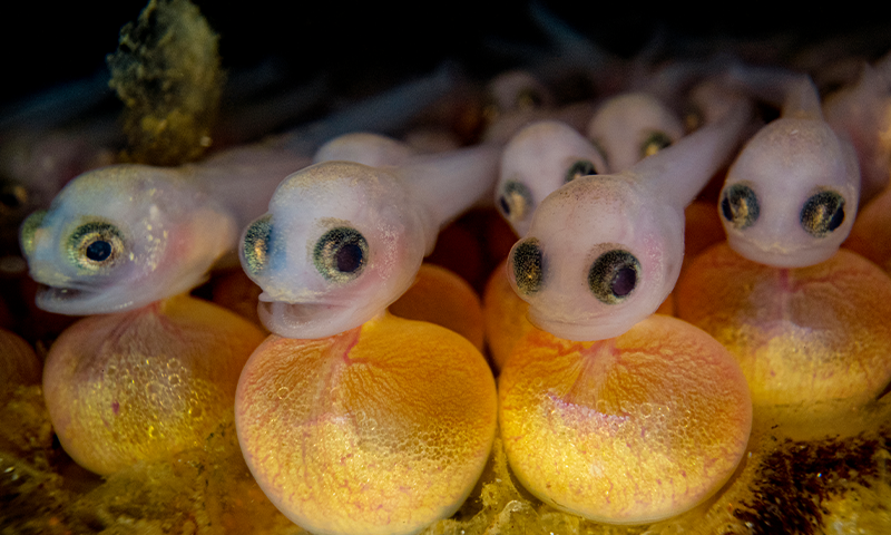 The world of larval plainfin midshipman fish may look alien, but it could be as close as the cobbles beneath your feet, if you walk the rocky shores found along much of the North American West Coast. Adults of this species swim each spring from the ocean depths—up to 1,200 feet beneath the surface—to the intertidal zone to spawn in the shallows, where males excavate nests beneath large rocks. There, they set about trying to attract females and, if successful, rear young like those pictured in this award-winning image by Shane Gross.