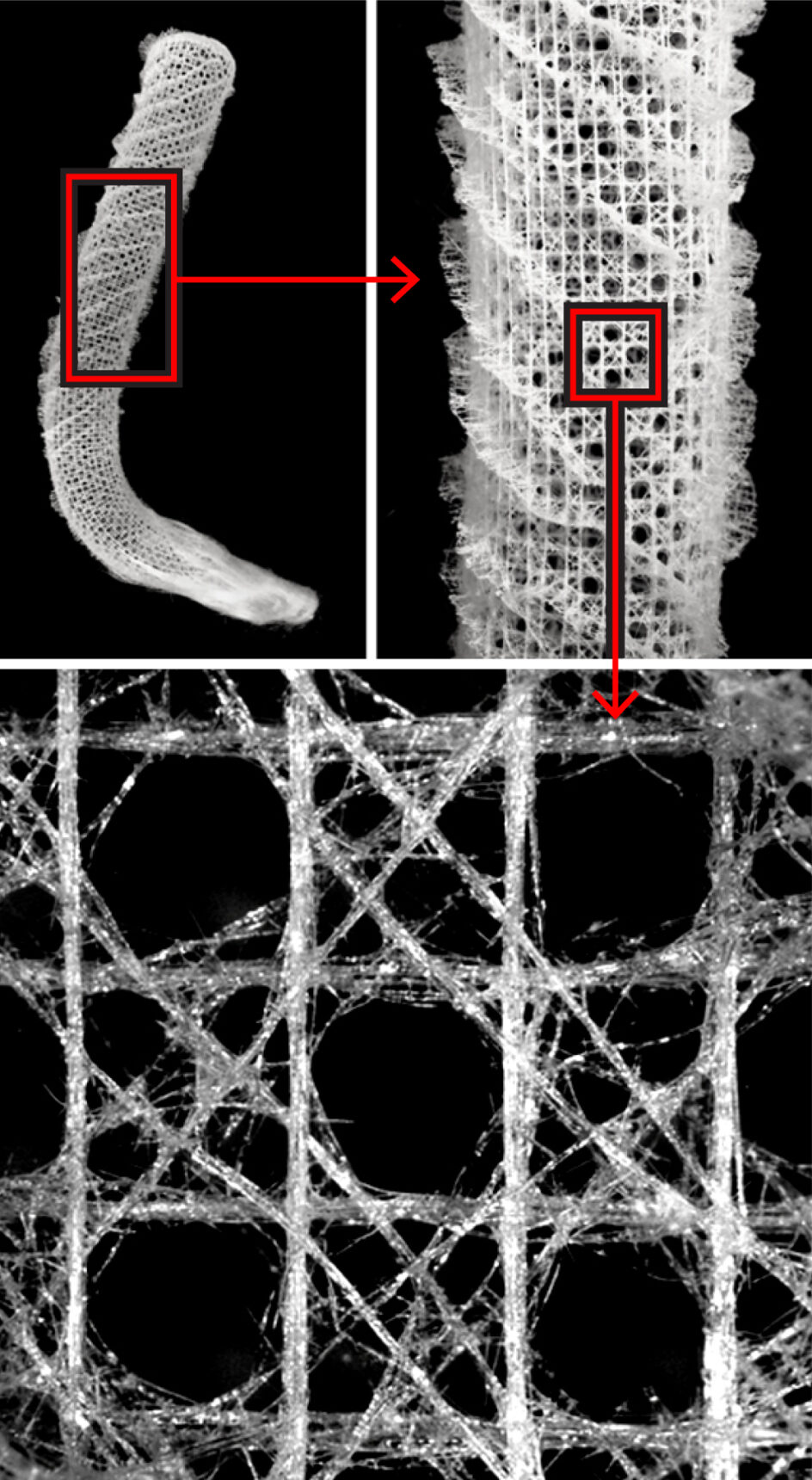 Brute strength is not all Venus’ flower basket offers. The lattice walls of its skeleton are just one of several levels of complexity in its structure. Zoom in to see how its fibers can shift slightly within its lattice walls, or how its arrangement of proteins and silica molecules stops fractures in their tracks. Zoom out to examine how the lacy skeleton allows the living sponge to filter water. Bhate’s team is investigating the way some of the strands aren’t completely attached to the others, allowing the skeleton flexibility, and he’s curious about the way the structure would stand up to twisting.
