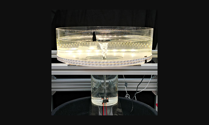 Lead image: This photo shows the upper part of the water tornado model. The acrylic glass tank has a diameter of 50 centimeters and is illuminated with LED strips. The water forms a vortex whose surface shape reproduces the profile of a gravitational field. The analysis showed that the motion of the water closely resembles the behavior seen in protoplanetary discs. Credit: T. Müller (MPIA / HdA)