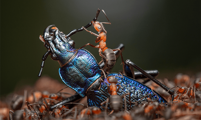 A lone ant summits a fallen blue ground beetle (Carabus intricatus), lifting a limb as if waving a victory flag over its unfortunate victim. German photographer Ingo Arndt captured this triumphant scene to document the chaotic experience that is feeding time for a colony of wood ants (Formica polyctena).