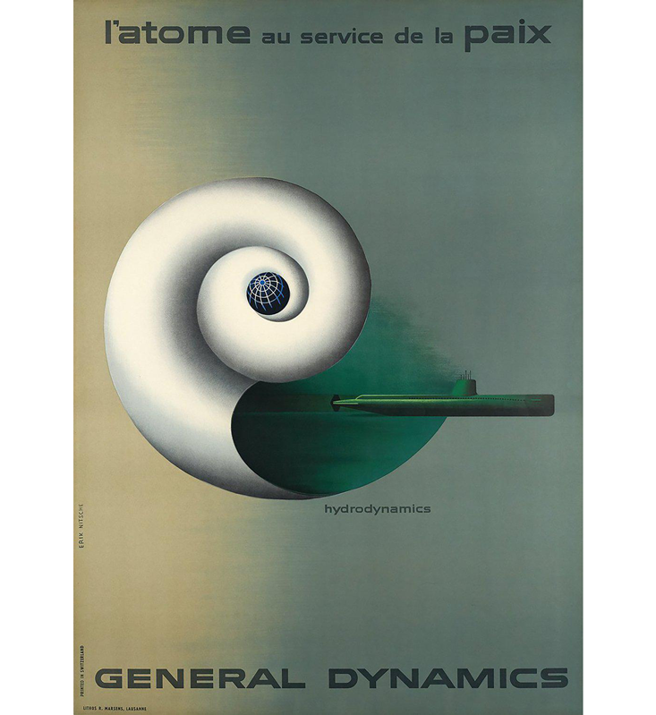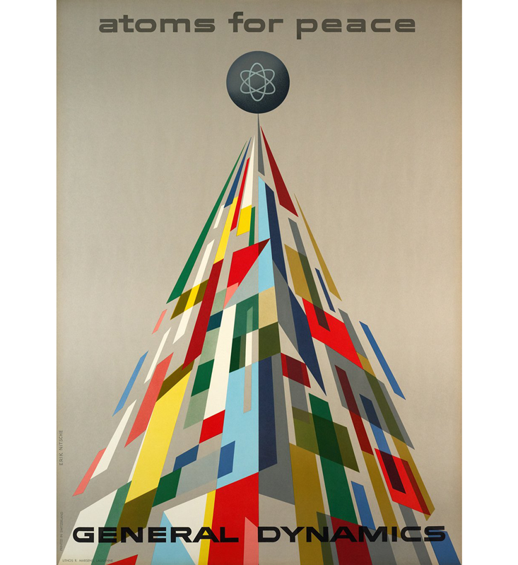 His primary publicity instrument was the Swiss-born graphic designer Erik Nitsche, whose style fit this vision. Nitsche’s work for General Dynamics would mark him as one of the most influential modernist graphic designers. His drawings were suggestive of a scientific mindset, with an aesthetic sensibility that blended imagination with clarity and orderliness. Simple yet elegant, with precise shapes and lines but abstract in concept, his artistic renderings were the perfect fit for the relatively unknown future of atomic energy. As one writer later wrote, “Nitsche’s brand of artful futurism was copied by many others at the time and might be seen today as representative of the so-called ‘Atomic Style’ that emerged in the mid- to late-1950s.” He made six posters for Hopkins for the 1955 conference, each featuring the firm’s name along with the phrase “Atoms for Peace” in one language or another. The French one featured the word “hydrodynamics” along with a visual of the Nautilus, positioned not as a war vessel but as a harbinger of peace. The German one, on “aerodynamics,” showed the atomic-powered airplane then under development. There was a Japanese one too, on “nucleodynamics,” and it was highly abstract—a series of colored squares (some have described it as a rendering of isotopes), with an inset photograph of two physicians.