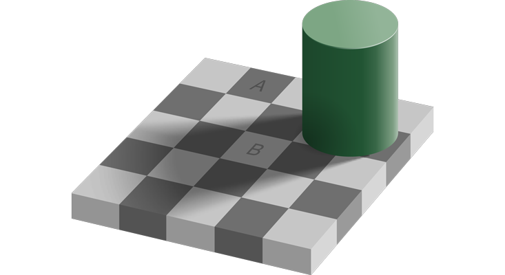 To perceive the outside world, our brain combines signals entering our brains through our eyes with what we expect the world to look like based on our past experiences.2,3 This means that our perception of the outside world is strongly influenced by what we believe. An example of this is the checker shadow illusion shown below in which our knowledge about how shadows influence color makes the B square look lighter than the A square, when in fact they are exactly the same shade.