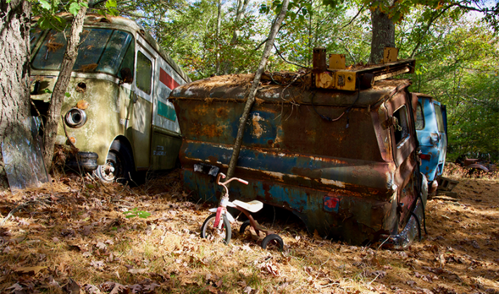 As kids, the two of us were often left to navigate the treacherous, lost world realms of the junkyard together—acres of vine-encrusted carapaces of old cars, broken school buses, and rotting wooden ships, all scattered around the swamp and bluestone cliffs that ran through our property in upstate New York. We pillaged for presents for my mother in trunks of cars and burned-out trailers. We skated the swamp in winter, shoveling labyrinthine paths around the trees and root islands. We pretended to drive the crumpled convertibles and sail the ships that slowly filled with the soil of fallen leaves. As hostile a place it may have seemed to outsiders, to us the junkyard was an island of consistency, a comforting place with the aging faces of the cars that had stood watch over our childhoods. To be banished from the junkyard was to send my brother out to sea.