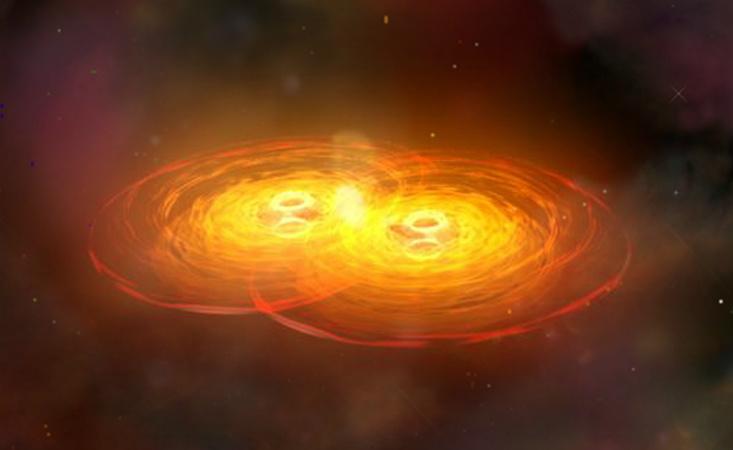 Theoretical models show that during galactic mergers, black holes fall into mutual orbit, starting with wide separation and gradually spiraling in toward each other. General relativity predicts that two black holes will radiate energy away in the form of gravitational radiation as they draw ever closer, until eventually they coalesce.