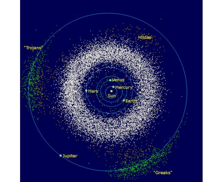 But there is another type of Trojan: an orbit. A swarm of thousands of asteroids share an orbit with Jupiter. They are not right next to the planet, like moons, but rather clustered in two clumps, one ahead of Jupiter on its orbit and one behind. The leading clump is called the “Greeks” and the trailing clump the “Trojans,” but they are usually just lumped together and simply called Jupiter’s Trojans. Many of them are named after mythological figures from the Trojan wars.