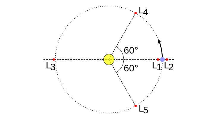 It turns out that this was figured out way back in 1772 by French mathematician Joseph-Louis Lagrange. If we visualize a planet’s orbit around a star, there are a few special points where an extra body can orbit at the same rate as the planet. These are called the Lagrange points, and there are five of them, named L1 through L5.