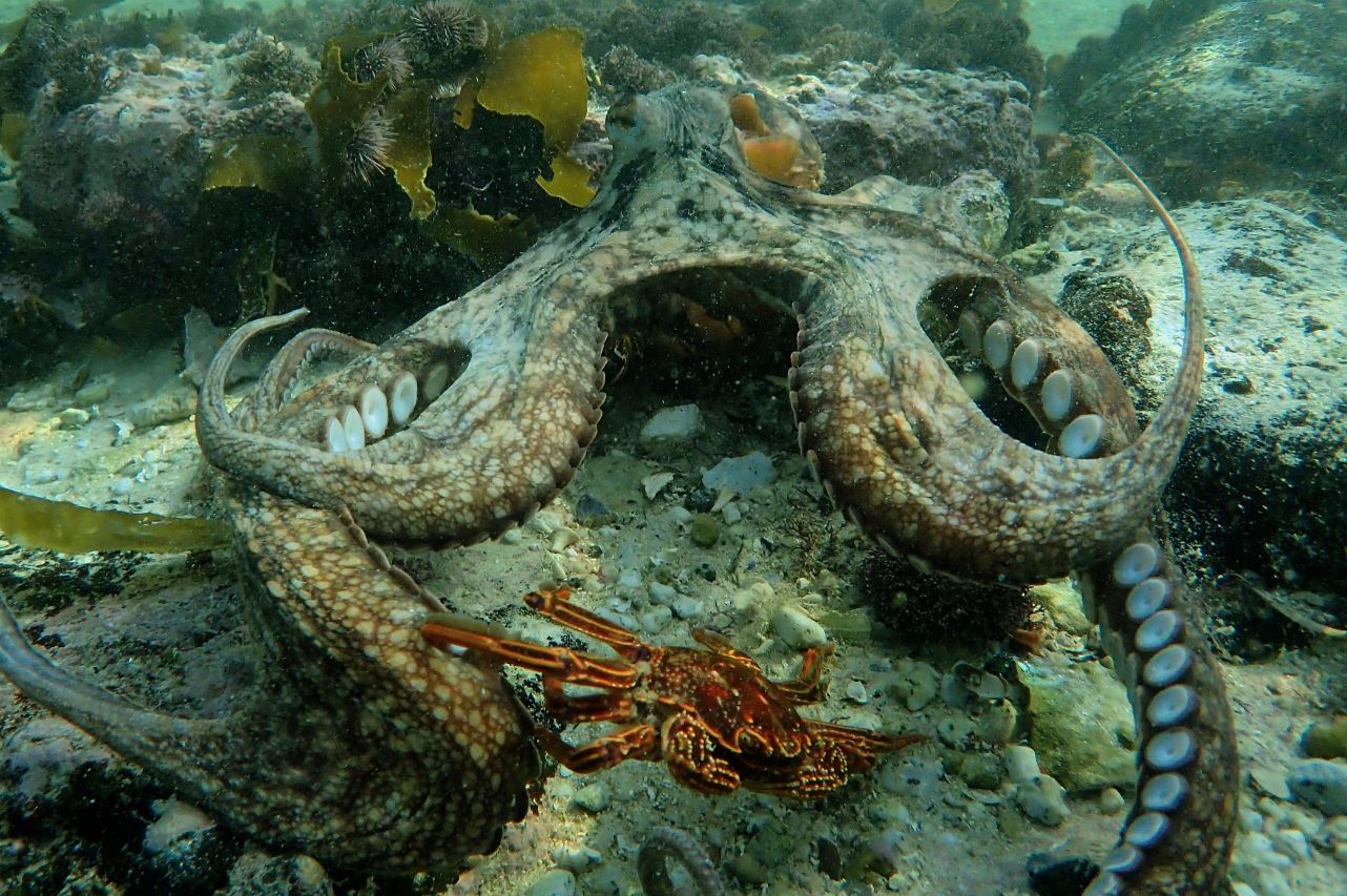 This morning I was out as usual and there was just an incredible sight in the very shallow water. This beautiful, fully wild octopus was moving around, hunting in the shallows. And it was just absolutely wild, absolutely free. They only live for a year, a year and a half—so that animal hasn't got many existential problems. It is just thriving in its wildness.