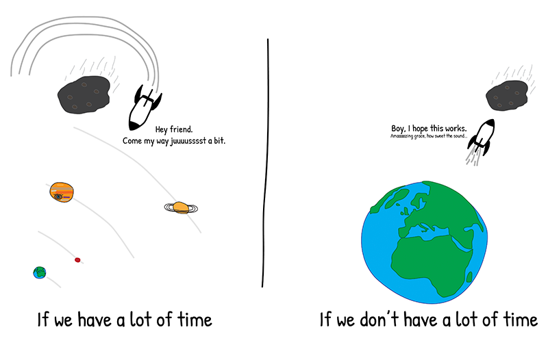 A lot of it is how much time we have. In Don't Look Up, there was very little time, six months or something. If we've got six to 10 years, then that's a different story. Then we have a lot of different options, because moving an asteroid or comet's trajectory toward Earth is possible in a lot of different ways, and it's a lot more possible if you've got a lot of time. And if you've got a lot of time, then you can do things, like park a spacecraft next to it. You can use the spacecraft's gravity to move it, the gravity-tractor method. There's people that say you could paint one side of the asteroid white so you get a lot of different behavior from the sun's rays, so it would slowly shift its trajectory. If you don't have a lot of time, you're pretty much going the military route, Armageddon-style or whatever they were trying on Don't Look Up.