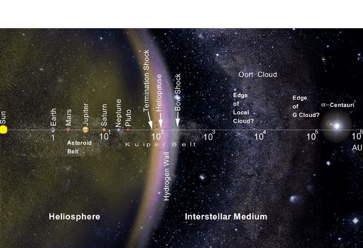 What might count as our solar system’s boundary? There is no definite point at which light from our sun completely fades, or where its gravity stops being felt, so neither of those could mark it. But the heliosphere can. It “moves through the galaxy, keeping our home safe,” McComas says. The sun’s solar wind, an outflow of ionized gas, or plasma, pushes out against the galactic material between stars, also called the “interstellar medium.” The interstellar medium in our very local region is a mixture of plasma, helium, and neutral hydrogen. It is formed by warm, partially ionized clouds found in the Local Bubble, a large cavity filled with plasma that was likely produced by multiple supernova explosions, along with interstellar dust and other stellar winds. The barrier separating us from this occupies a region far beyond the orbit of Pluto, one you can define and measure.