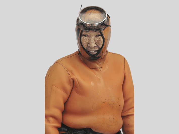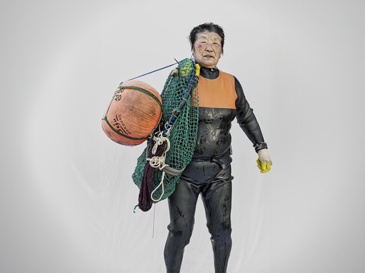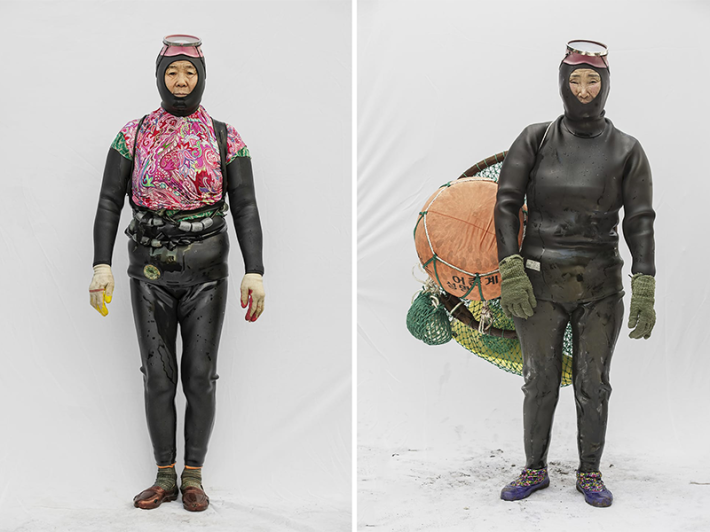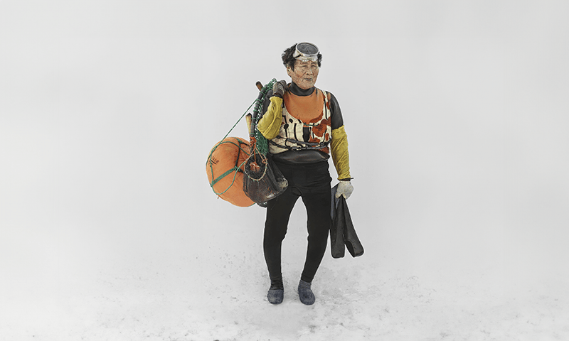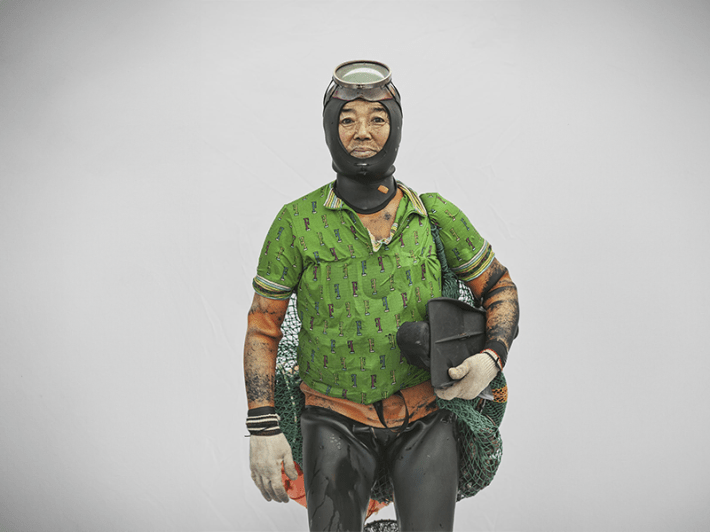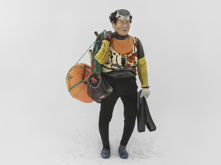 Captured just after they exited the water, the haenyeo in Kim’s life-size portraits are situated against a stark, white backdrop, which emphasizes their dirt-speckled shoes and wet, shining gear. The equipment they carry includes a tewak—the orange sphere some of them have slung over their shoulders, which floats at the surface during each dive—and lead weights attached to their waists to hasten the descent.