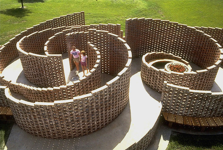 Like Derges, American artist Athena Tacha was inspired by Leonardo’s sketches of vortices, a debt that she made particularly explicit in her 1977 sculpture maquette Eddies/Interchanges (Homage to Leonardo). Much of Tacha’s work over the past several decades is an enquiry into the deep structures of turbulent flow, which she often reduces to their abstract essence and transforms into something more permanent and rigid. Because her work includes large-scale public commissions, these architectural sculptures allow people to literally get inside the forms and experience them as if they were a particle borne along in the flow—for example, in the brickwork-trellis maze of Mariathne (1985-6) and the stepped crescent forms of the terraced courtyard space Green Acres (1985-7). If you want a visceral sense of the real tantalizing confusion of a turbulent maelstrom, no scientific description will improve on Tacha’s photographic series such as Chaos (1998).