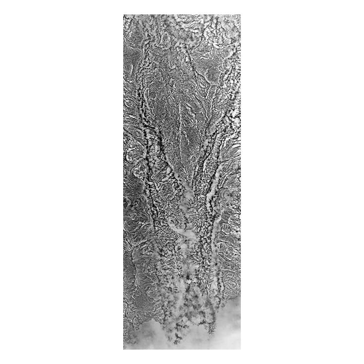 In a series of works in the 1990s, Derges captured these turbulent structures in the River Taw on Dartmoor by placing large sheets of photographic paper, protected with a waterproof covering, just beneath the water surface at night and exposing them with a single bright flash of light. In her inspiration, motives, and techniques, there is little distance between what Derges did and what an experimental scientist might do: Such “shadowgraphs” are commonly used by fluid dynamicists to capture and study flow structures. But for Derges this “data gathering” becomes an artistic moment.
