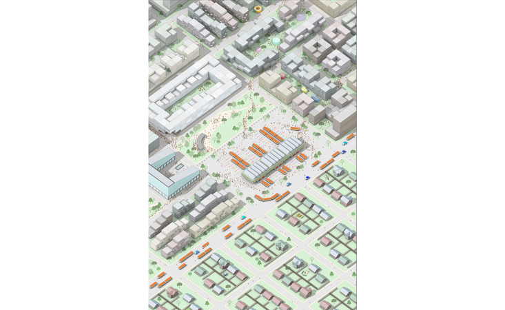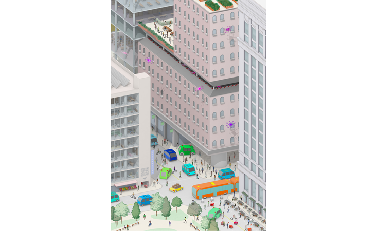 Despite all the new machine motion, on the streets people hardly take notice. That’s because the cloud is a clever choreographer, who makes her most important curtain call late at night. Only then do the ghost roads of the city truly come to life. Heavy haulers are sent out, keeping the streets clear of big commercial loads during the day. Municipal robofleets are unleashed to do the dull, dirty, and dangerous work of urban upkeep. Wayward bikes and scooters scurry back to charging docks and disinfection baths. The cute eight-passenger shuttles that have replaced school buses moonlight as parcel vans. Bending time with technology, it turns out, is one of flexible density’s secret weapons for sharing the city without overcrowding.