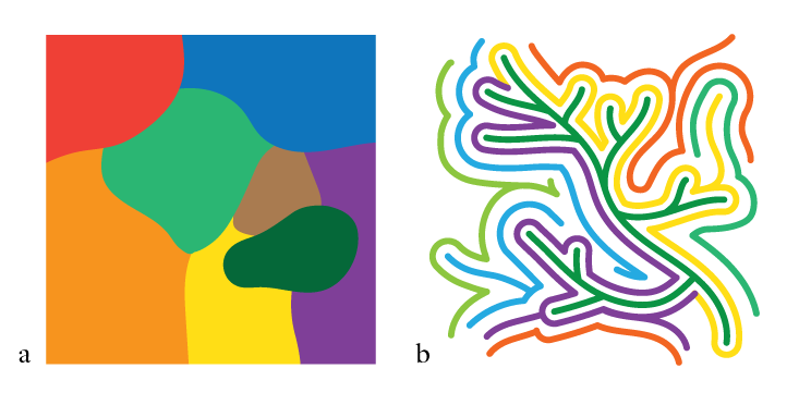 Naively, you might expect RNAs with a similar shape, and thus presumably phenotype, to share a similar sequence, so that a map of the possible sequences—the sequence space, which can be represented as a many-dimensional space where each grid point corresponds to a particular sequence—is divided up into various “shape kingdoms” (See Not a Patch, a). But that wasn’t what Schuster found. Instead, RNAs with the same shape could vary very widely in sequence: You could get the same shape, and therefore potentially the same kind of catalytic function, from very different sequences. But these phenotypic siblings weren’t totally isolated from one another in distant parts of the sequence space. Instead, RNAs with the same kind of shape were connected in a network that weaved its way throughout pretty much the whole of sequence space. You could go from one sequence to another with the same shape (and thus much the same function) via a succession of small changes to the sequence, as if proceeding through a rail network station by station. Such changes are called neutral mutations, because they are neither adaptively beneficial nor detrimental. (In fact even if mutations are not strictly neutral but slightly decrease fitness, as many do, they can persist for a long time in a population as if they were quasi-neutral.)