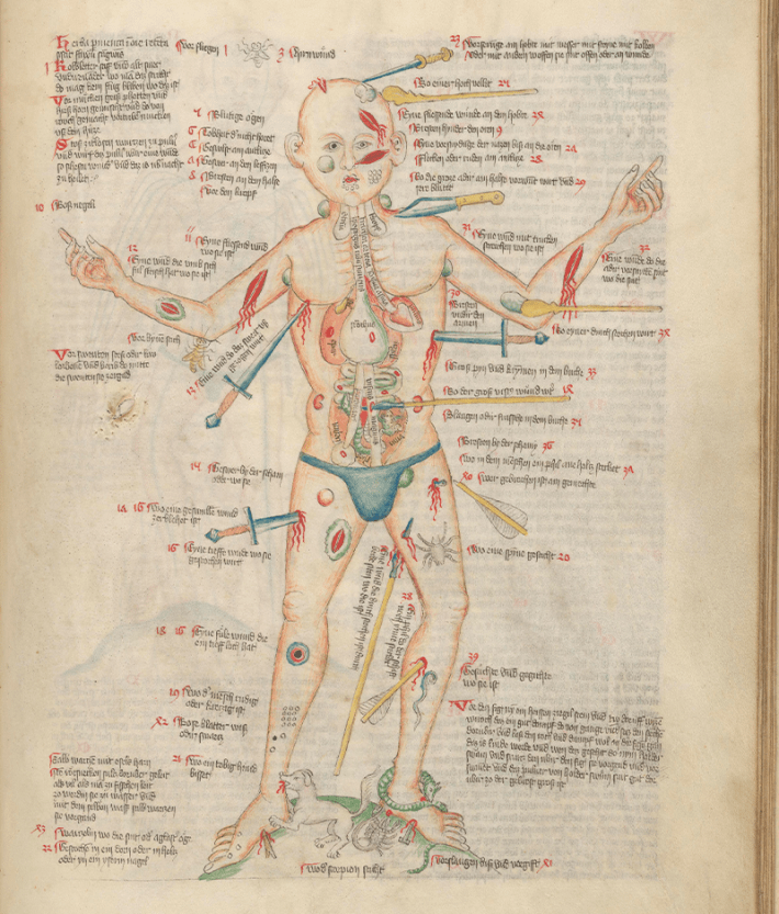 The Wound Man is an image at once troubling and enigmatic. A male figure looks out from the parchment page bearing a multitude of graphic wounds. His skin is covered in bleeding cuts and lesions, stabbed and sliced by elaborately detailed knives, spears, and swords of varying sizes, many of which remain stuck threateningly in the body. His head and thighs are pierced with arrows, some intact, some snapped down to just their heads or shafts, their fletching feathering his form. A club metes out blunt trauma at the shoulder, while inside his chest—rendered eerily transparent so as to reveal the structure of his intestines, lungs, spleen—the tip of a dagger punctures his heart.