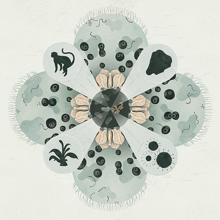 At first glance, a tree could not be more different from the caterpillars that eat its leaves, the mushrooms sprouting from its bark, the grass growing by its trunk, or the humans canoodling under its shade. Appearances, however, can be deceiving. Zoom in closely, and you will see that these organisms are all surprisingly similar at a microscopic level. Specifically, they all consist of cells that share the same basic architecture.