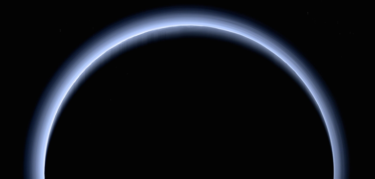 For a long time, Pluto was believed to be an airless, inert world. New Horizons proved otherwise. If Pluto were a bare ball of ice, it would look like a black disk, nearly invisible. The rich blue rim tells a very different story. Despite being smaller than Earth’s moon, and despite temperatures hovering around -390 degrees Fahrenheit, Pluto has a complex atmosphere composed of nitrogen laced with methane and carbon monoxide and filled with an unexpected blue haze. Look closely and you can see that the haze is divided into dozens of layers. Scientists working with the New Horizon data believe the haze is composed of photochemical smog (not unlike L.A. on a bad day), including organic compounds like ethylene and acetylene. The particles are so fine that they scatter mostly blue light, the same reason that our skies are blue. Why they follow such a complicated, layered structure, nobody knows.