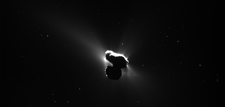 Comet 67P spent most of its lifetime—billions of years—in the dim gloom of the Kuiper Belt, a region of the outer solar system that extends well beyond Pluto. At some point, it got disturbed and fell inward toward the sun. Then in 1959 it had the misfortune to pass close to Jupiter, which pushed it even closer. Now its frozen gases regularly vaporize under solar heat, releasing clouds of dust that make the jets and streamers visible. What you see here, never seen before, is the first stage of the process that gives comets their tails. The comet itself is about as black as a lump of coal; the vast trail of gas and dust it leaves behind is what catches the sunlight and makes comets appear to glow beautifully in our skies.