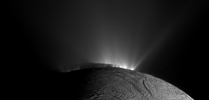 In this Cassini image, taken on Nov. 30, 2010, multiple geysers are spouting off in a variety of directions. The shadow of Enceladus against the geysers helped scientists determine the location and geometry of the geysers; watching how those shadows changed over the course of a season further refined the information. Chemical analysis of the material that is shooting out delivered several bits of exciting news. Along with the expected water and salts, the geysers contain organic compounds. Cassini’s instruments also detected the presence of silica, which can get mixed with water in undersea volcanoes.