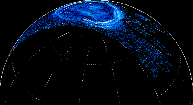 Everything on Jupiter is supersized, and its auroras are no exception. The aurora ring is more than 20,000 miles wide, about three times the diameter of Earth. Jupiter’s magnetic field is so strong that it creates electric currents connected to its moons, hundreds of thousands away; where those currents hit the planet, they created the dots in the image. And when charged particles crash into the atmosphere, they do so with up to 30 times as much energy as in the wimpy visible-light auroras on Earth.